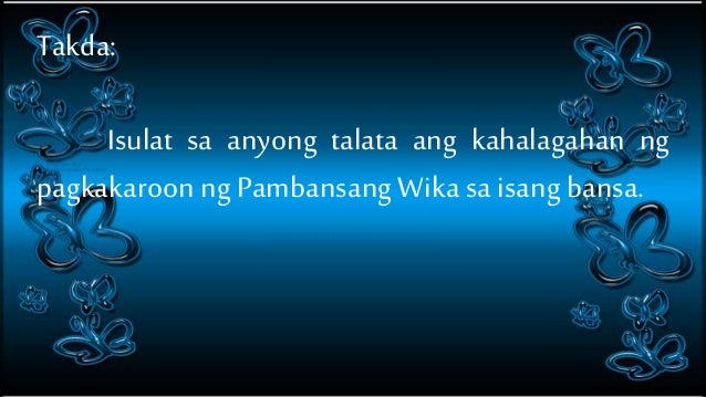 Una na rito nagkakaroon ng wikang mabisang nauunawaan. Kaya ating pagyamaning kusa gaya ng inang sa atin ay nagpala Ito ang mga tanyag na katagang nagmula sa ating pambansang bayani na si Gat. Rizal na nagbibigay importansya sa kahalagahan ng wika sa buhay ng isang tao.