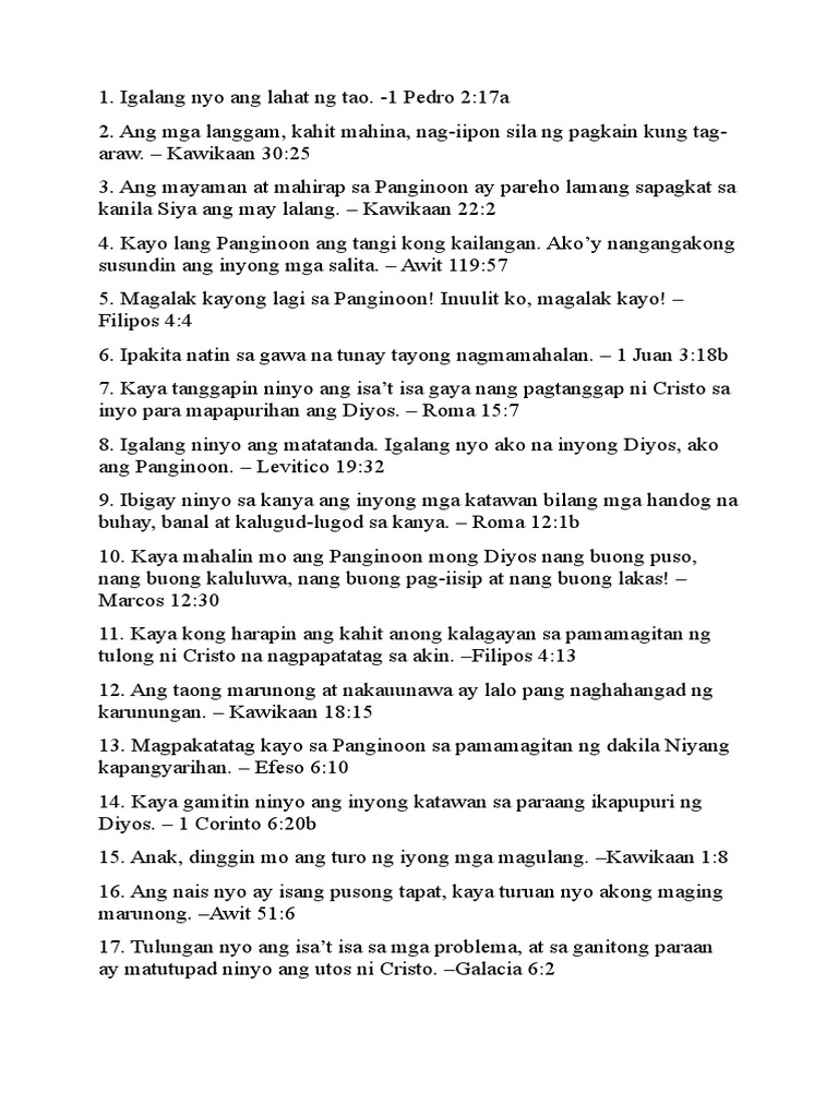 7 Kahit mga bagay na maselan ang pag-uusapan gaya ng pakikipag-date iwasang puro babala na lang ang sabihin dahil baka hindi mo na maituro sa iyong mga anak kung ano ang tamang gawin. Mahal na mahal mo ang iyong mga magulangisang araw habang ikaw ay nasa paaralannakatanggap ka ng balita na naaksidente sila at nag aagaw buhay sa ospital hindi ka nakakalimot sa diyos sa araw araw at nagsisilbi ka sa inyong simbahan ngunit pareho silang binawian ng buhay dahil sa aksidente na kanyang sinapitsisihin mo ba ang diyos sa pangyayaring itoano ang iyong. Igalang mo ang iyong ama at ina na siyang unang utos na may pangako upang yumaon kang mabuti at ikaw ay mabuhay na malaon sa lupa Efeso 61-3.