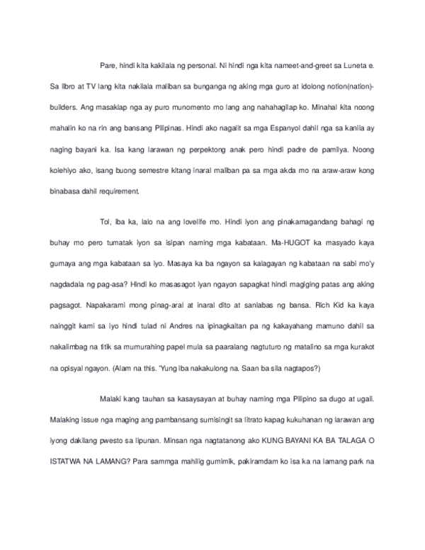 Gumamit na kayo ng kahit anong plantsa pero hindi nyo natatanggal ang gusot sa buhay ko. Bilang isang Pilipino na buo ang loob at may agimat ang dugo si Rizal ay hindi lang isang tao mula sa noong nakaraan kung hindi isang insperasyon at iang dahilan na wala tayo sa mga. Ating mapansin dito sa kanyang sulat na pinamagatang ANG LIHAM NI DR.