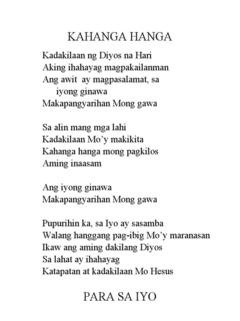 A d e sa alin mang mga lahi a d e kadakilaan moy makikita a d e kahanga-hanga mong pagkilos a d e aming. Kayat dapat namang sa Panginoong Diyos ay magpasalamat dahil sa pag-ibig at kahanga-hanga niyang pagliligtas. Bawat sandali ng aking buhayPunung-puno ng Yong kahabaganAt kung ako.