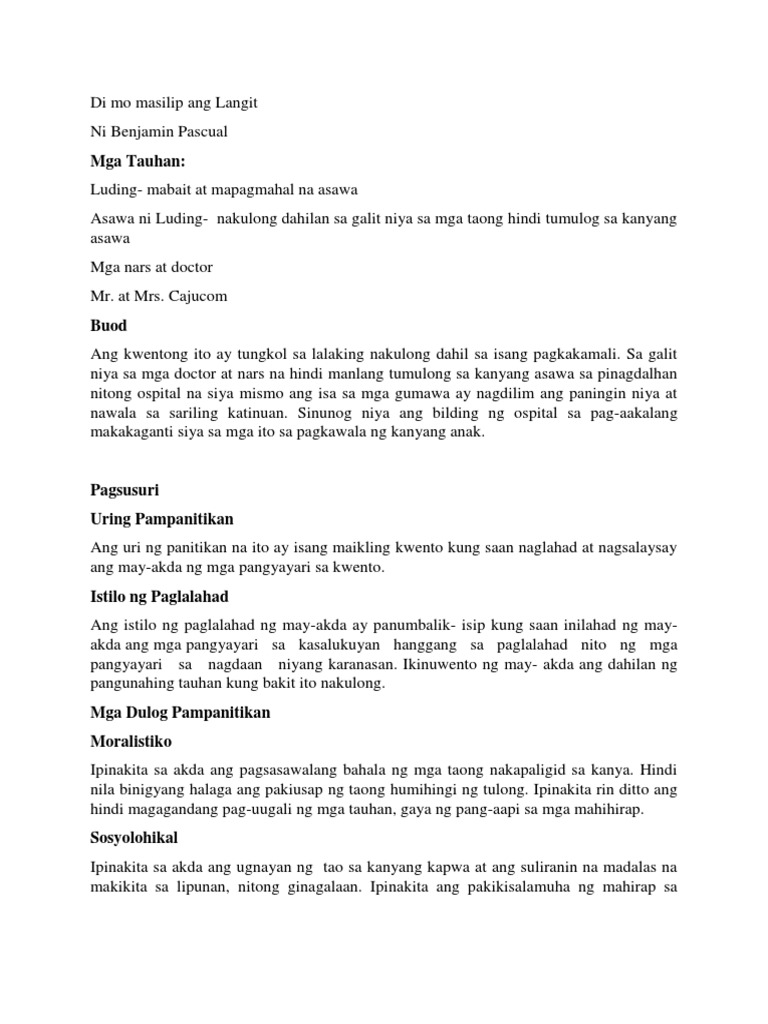 GngMylene Barzuela fBSED-3A FILIPINO MAJOR SMF10 fPanimula Ang kwentong ito ay tungkol sa lalakeng nakulong dahil sa isang pagkakamaliSa galit niya sa mga doctor at nars na. Di Mo Masilip Ang Langit Ni Benjamin Pascual. At pag-iinitan ka pa.