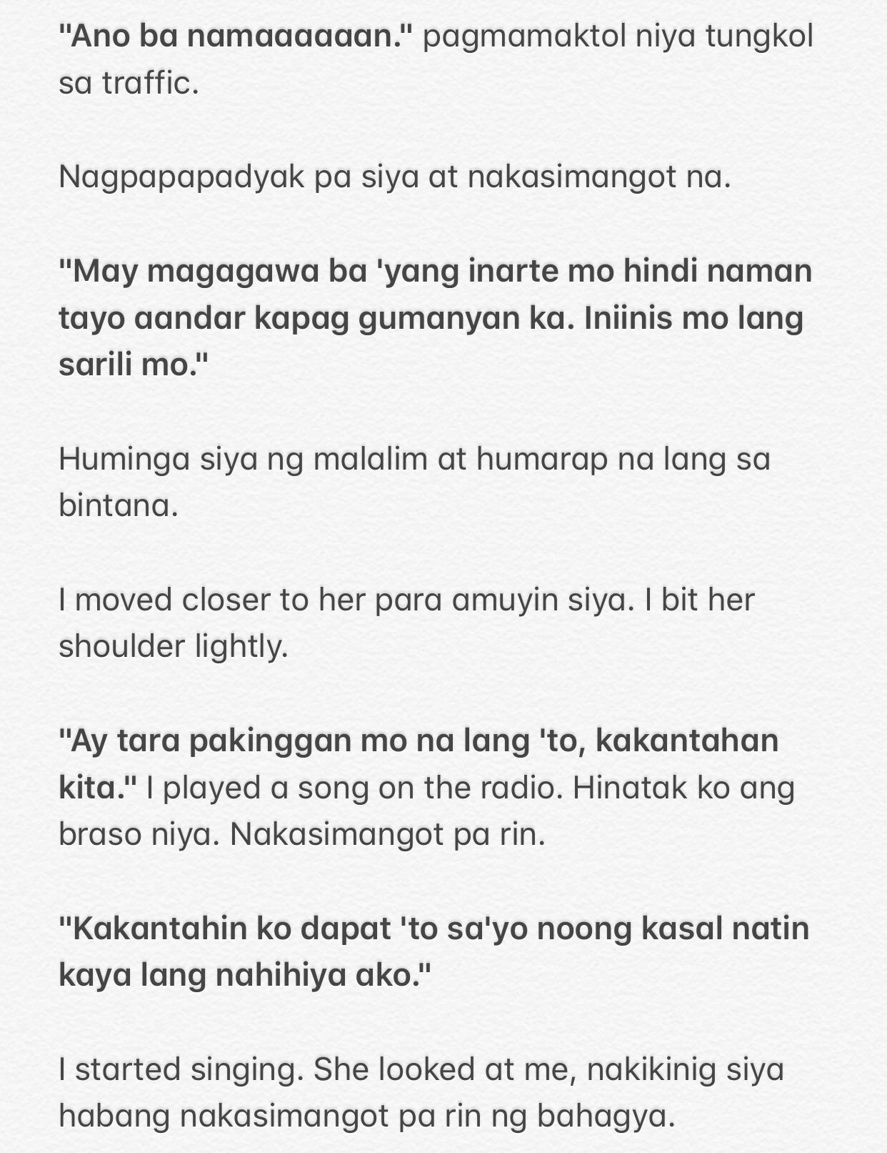 Ingatan mo ang sarili mo ha papakasalan pa kita. Sinabi ng kalimutan mo na ung nagyari kagabi eh. Sir ngayon alam ko na kung ano ang naramdaman ng mga lalaki tinangihan ko noon masakit pala kasi ikaw ginawa mo rin sa akin ninakaw mo ang saya sa puso at ngiti sa mga labi ko kasi bago ako matulog tinitingnan ko muna ang cellphone ko binabasa ko ang mga conversation natin pero ng sinabi mo sa akin na huwag na ako mag text sa iyo binura ko na ang lahat ng text conversation natin ang.