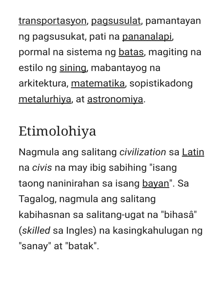 Ang katagang pamumuhay ng lungsod ang madaling paraan upang mailarawan ang salitang sibilisasyon. Ang kabihasnan ay tumutukoy sa kinagawian at pinipino ng maraming. Get the answers you need now.