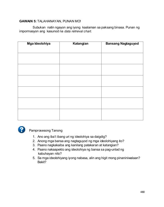 Anu anung impormasyon ang mahihimuha mo mula sa ideolohiya. Binubuo ito ng mga paniniwala ukol sa pananaw sa sandaigdigan ng programa para sa pampulitika at panlipunang pagbabago ng pagkaunawang kailangang ipaglaban ang programang ito at ng pag-akit sa mga tao na isagawa ang. 1 Get Iba pang mga katanungan. Magbigay opinyon tungkol sa buhay natin noon at ngayon.