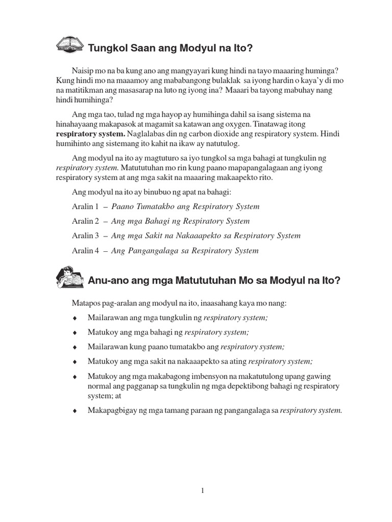 Paano nagwowork ang iyong respiratory at circulatory system sa iyong katawan. 1 Tungkol Saan ang Modyul na Ito. Ipagpatuloy ang pagbabasa upang matutunan ang tungkol sa respiratory system.