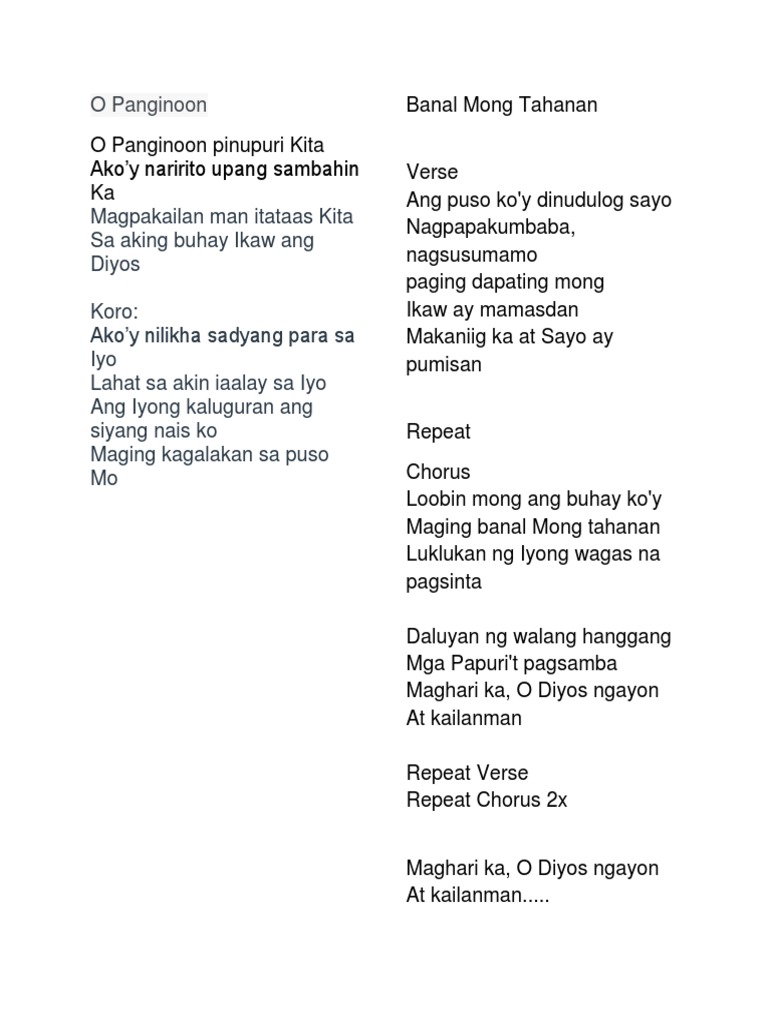 Ang puso koy dinudulog Sayo Nagpapakumbaba nagsusumamo Paging tapatin mong ikaw ay mamasdan Makaniig ka at Sayo ay pumisan. Banal Mong Tahanan - Musikatha Lyrics and Chords Download button is at the bottom. Loobin Mong ang buhay koy.